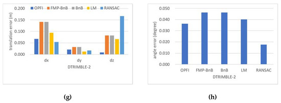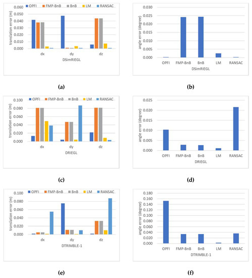 Figure 6 shows the accuracy of the estimated registration parameters. For the DSimRIEGL dataset, the translation vector accuracies of all algorithms are better than 0.05 m and the azimuth angle accuracies are better than 0.025 degrees. The RANSAC method achieves the best accuracy in translation vector estimation, and the OPFI method achieves the best accuracy in azimuth angle estimation. For the DRIEGL dataset, the OPFI method achieves the best accuracy in horizontal translation vector estimation. The vertical translation accuracy of OPFI is better than the FMP-BnB and BnB methods. The azimuth angle accuracy of OPFI is better than the RANSAC method. For the DTRIMBLE-1 dataset, OPFI achieves the best accuracy in vertical translation and x-direction of horizontal translation. The azimuth angle accuracies of all algorithms are better than 0.16 degrees. For the DTRIMBLE-2 dataset, OPFI achieves much better vertical translation accuracy than the other four algorithms, and achieves better accuracy than FMP-BnB and BnB in x and y-direction. In addition, the OPFI method achieves better azimuth angle accuracy than the other algorithms except for RANSAC.