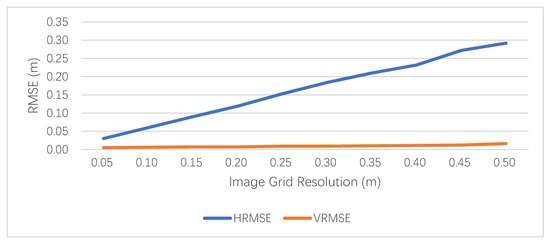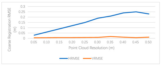 The density of point clouds varies in different applications. Suitability for point clouds with different density is important for a coarse registration method. Figure 11 illustrates the coarse registration results of point clouds with different point density. The point clouds are intentionally sampled to resolutions from 0.05 m to 0.5 m by a voxel grid sample algorithm. In feature image generation, the value of image grid resolution is set to the same as point resolution. Figure 11 shows that the vertical accuracy is almost not affected by the point resolution. The larger the point cloud resolution, the worse the registration accuracy. The horizontal accuracy is about half of the point resolution.