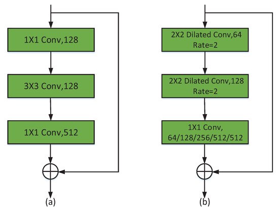 The residual block, proposed by He K et al. [26] in 2015, aims at solving the problem that training error increases as the network deepens, and helping alleviate the problems of vanishing gradient and exploding gradient. Inspired by the residual block, to further address the problem of small object misidentification in segmentation of water area remote sensing images, a modified residual block is added to the proposed SR-SegNet in the encoder. As shown in Figure 2a, it is a traditional bottleneck block in ResNet-50. This method protects information integrity by bypassing the input to the output directly. The residual block in ResNet-50 only needs to learn the difference between the input and output; this setup simplifies the learning objectives and reduces the difficulties, and thus solves the degradation problem during training process [28]. The residual block is especially suitable for small and medium-sized object recognitions in water body remote sensing images. However, using 1 × 1 convolution kernels in the traditional bottleneck block may lose the semantic information of water body. For better performance, two successive 2 × 2 convolution kernels are adopted in our modified residual block in this paper, and then a 1 × 1 convolution kernel is connected to them. To enlarge the receptive field to obtain more water body features without increasing the number of parameters, 2 × 2 dilated convolutions with a dilation rate of 2 are introduced into the first two layers of the modified residual block, which generates the same receptive field as 3 × 3 convolution kernels.