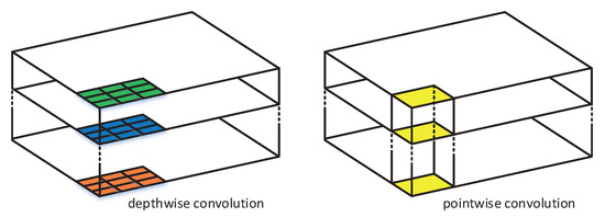 Figure 5 is a comparison between a standard convolution and the depth separable convolution. The standard convolution first performs a 3 × 3 × C convolution, then the batch normalization (BN) [30], and finally the nonlinear relu function [31]. Different from traditional convolution methods, the depthwise separable convolution applies a 3 × 3 × 1 depth convolution first, then the batch normalization and the nonlinear relu function, next a 1 × 1 × C point convolution, and last again the batch normalization and the nonlinear relu function. The standard convolution uses the complete 3 × 3 × C convolution kernel directly, but the depth separable convolution uses C single channel 3 × 3 convolution kernels at the same time [32]. For example, if N K × K standard convolutions of C channels each were used, the number of parameters would be NCK. However, for the depthwise separable convolutions, KxK depthwise convolutions of C channels each are performed at each channel of the input picture, and thus CK parameters are generated firstly. Next, N 1 × 1 × C pointwise convolutions are used to aggregate outputs, and thus NC parameters are generated. Therefore, the whole depth separable convolutions generates CK + NC parameters, many fewer than that of standard convolutions.