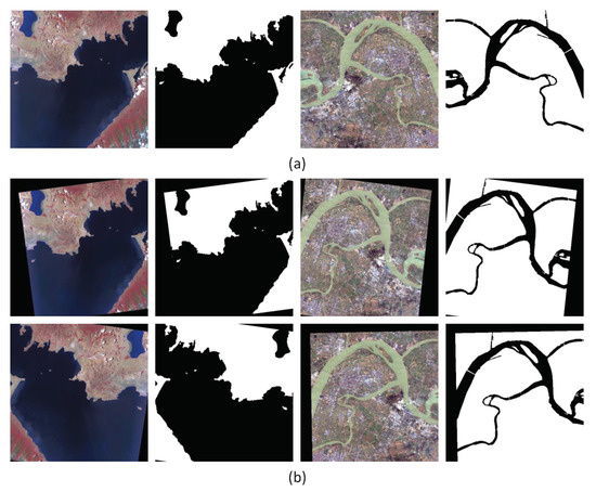 Image and label example from the Lake and Rive dataset: (a) origin remote sensing images and their ground truth; and (b) data augment results of images and their ground truth.