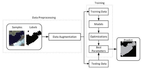 The proposed water area segmentation system is illustrated in Figure 7. First, the Lake and River dataset was preprocessed to generate more data for neural network training through data augmentation; this technique increases the complexity of data and effectively reduces the overfitting of training [39]. Second, the dataset was divided into training set and testing set, and the images from the training set were put into the model for training. The training procedure used the gradient descent algorithm. The labels were compared with predicted results, and the parameters were updated continuously by using back propagation and calculating the loss function [40]. Finally, the model’s optimal parameters were saved to predict and evaluate lake and river images in the testing set.