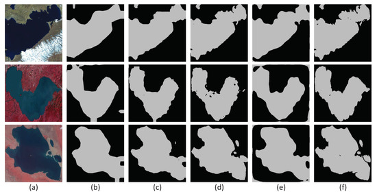 Test images, their predicted label images of compared five methods (gray: water body; black: background): (a) input image; (b) FCN32s; (c) FCN16s; (d) FCN8s; (e) DeconvNet; and (f) SR-SegNet v2. First row,: Namtso Lake; second row, Chaohu Lake; third row, Qinghai Lake.