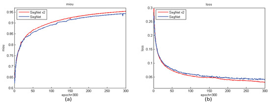 Iteration plot on the Lake and Rive dataset of variations of the proposed methods: (a) plot of model Miou on the training dataset for SegNet and SR-SegNet v2; and (b) plot of model loss (cross-entropy) on the training dataset for SegNet and SR-SegNet v2.