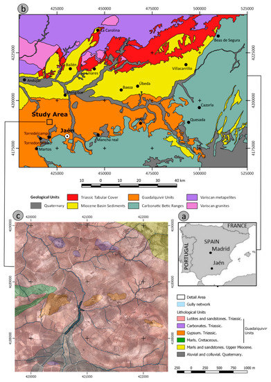 Geographical and geological location: (a) geographical location; (b) geological setting; (c) study area: lithological units and gully network delimited from the analysis made in this study (DoD of the complete period) and photointerpretation. Coordinates are in ETRS89-UTM30.