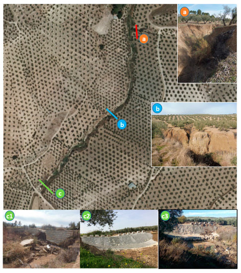 The area is affected by intense erosion, both laminar and gully, in addition to other superficial processes such as landslides [57,61]. Some sections of the gully area studied, which sometimes affect rural roads and paths (Figure 2c), are shown in Figure 2.