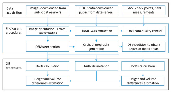 This paper aims to describe a methodology for the identification and quantification of gully erosion through a long period (1980–2016), based on aerial photogrammetry and LiDAR techniques. For this objective, only those data available on public spatial data infrastructures (SDI) or download servers have been used. Ground control points (GCPs) from the LiDAR point clouds were extracted, allowing the alignment of historical photogrammetric flights in the same common coordinate reference system without the need for field surveyed GCPs, although some check points were measured with GNSS in the field in order to monitor the whole process. From these flights, DSMs, DTMs and differential models (DoDs) were generated in order to analyze the effects of gully erosion on olive groves in a selected study area of 7.5 km2 in the province of Jaén (Southern Spain). This methodology has been validated by means of the estimation of errors and uncertainties from the models obtained. The analysis has been addressed calculating the height differences and volumes between models and their corresponding rates along the different periods considered. Furthermore, a detailed area where the erosion processes are more intense was considered to monitor the gully evolution and to study the relationships with the rainfalls as triggering factor. Finally, to complete the validation analysis and limitations of the methodology employed, DSMs were edited to obtain DTMs, comparing the results obtained in both approaches.