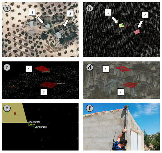 Measurement of roof corners for ground control/check points: (a) aerial image of two agricultural sheds (1,2) used for ground control/check points extraction; (b) LiDAR point cloud with the flat roofs of the sheds marked; (c) minimum bounding rectangles adjusted to the LiDAR points located on top of the flat shed roofs. LiDAR point cloud is also represented; (d) minimum bounding rectangles adjusted to the LiDAR points located on top of the flat shed roofs. DSM is represented; (e) corner of the minimum bounding box and field-measured GNSS. The distance represents the error between the corner measured in field (with GNSS) and that computed with the minimum bounding box adjusted to the LiDAR points on top of the roof; (f) GNSS field-measurement of a shed roof corner.