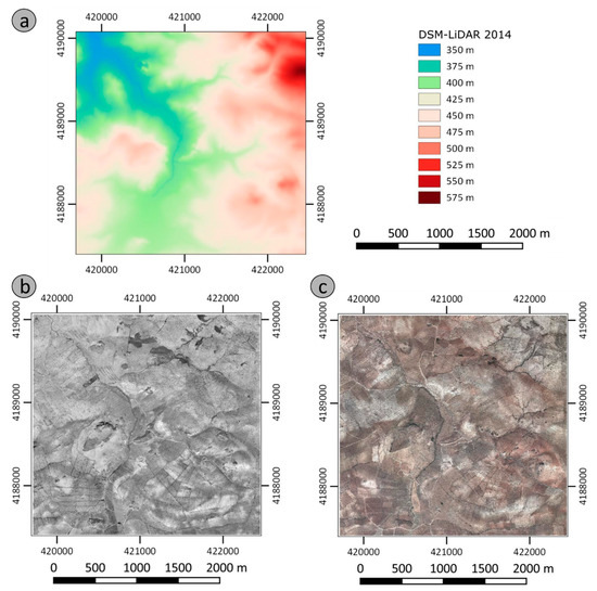 DSMs and orthophotographs: (a) DSM derived from LiDAR data (2014); (b) orthophotograph of 1980; (c) orthophotograph of 2016. Coordinates are in ETRS89-UTM30.