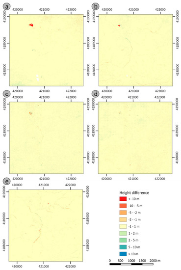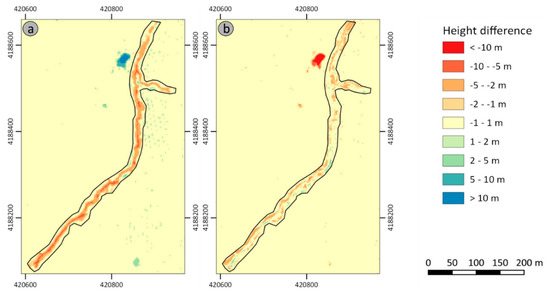 Regarding DSMs (Table 8a), the average rates for depletion height difference are below 0.10 m/year for most periods, except for 2009–2011 and 2011–2013 when the rates reach 0.50 and 0.30 m/year, respectively, 0.05 m/year being the accumulated rate for the complete period. Meanwhile, the rates for deposition show values lower than 0.10 m/year for every period, with the rate for the complete period being close to 0. Finally, the balance height differences present usually rates lower than 0.05 m/year in absolute value, except for 2009–2011 and 2011–2013 when the rates were of −0.40 and −0.30 m/year, respectively, while the balance rate for the complete period was about −0.05 m/year.