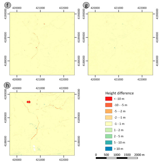 DSMs of differences (DoDs) of the whole area: (a) period 1980–1996; (b) period 1996–2001; (c) period 2001–2005; (d) period 2005–2009; (e) period 2009–2011. Coordinates are in ETRS89/UTM30; DSMs of differences (DoDs) of the whole area: (f) period 2011–2013; (g) period 2013–2016; (h) complete period (1980–2016). Coordinates are in ETRS89/UTM30.