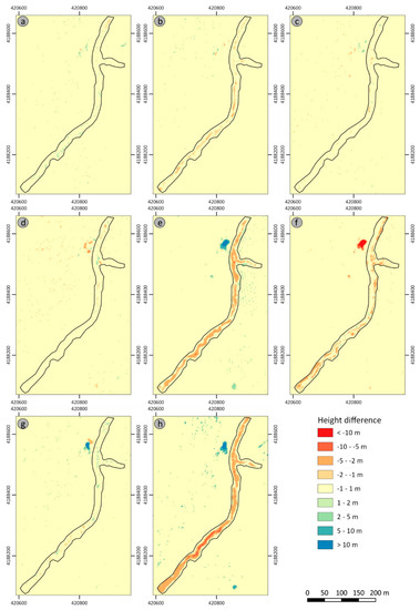 DSMs of differences (DoDs) of the detailed area: (a) period 1980–1996; (b) period 1996–2001; (c) period 2001–2005; (d) period 2005–2009; (e) period 2009–2011; (f) period 2011–2013; (g) period 2013–2016; (h) complete period (1980–2016).