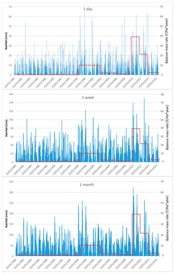 The results of volume calculations are shown in Table 7, where it is observed that the volumes involved in the complete period are about 100,000 m3 for depletion and about 17,000 m3 for deposition processes, which results in a negative balance of waste material of 85,000 m3. The rates are near 2800 m3/year for depletion processes and about 500 m3/year for deposition, with a balance (waste) rate of almost 2400 m3/year in absolute value. Translated to mass rates, the values estimated for the whole period are of almost 8 t/ha*year for depletion processes, 2 t/ha*year for deposition and 5.5 t/ha*year for the balance. However, the volumes and rates vary greatly by periods, and thus, there are periods with larger amounts of material motion such as 2009–2011 and 2011–2013 that present depletion rates of 20,000–30,000 m3/year, deposition rates around 8000–10,000 m3/year and waste rates of 10,000–20,000 m3/year. The remaining periods present depletion rates lower than 10,000 m3/year, deposition rates lower than 5000 m3/year with negative balance rates usually lower than 5000 m3/year. The mass rates present in some periods such as 2009–2011 and 2011–2013 values higher than 30–60 t/ha*year for depletion processes, around 13–20 t/ha*year for deposition processes and between 20 and 40 t/ha*year for the negative balance. The remaining periods present rates lower than 10 t/ha*year for depletion and deposition processes and usually lower than 2 t/ha*year for the balance, except for the period 1996–2001, which almost reaches 10 t/ha*year.