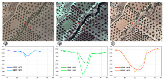 Orthophotographs and DSMs/DTMs sections: (a) orthophotograph of 2009; (b) orthophotograph of 2011; (c) orthophotograph of 2013; (d) sections of 2009; (e) sections of 2011; (f) sections of 2013.