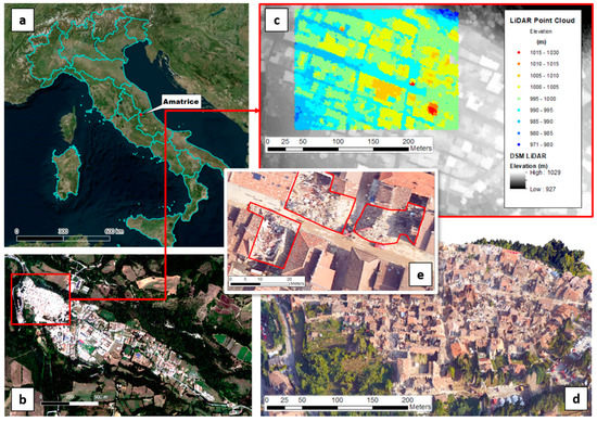 (a) Amatrice location (Central Italy); (b) WorldView-3 image (Amatrice inner city within the red box); (c) Example of LiDAR Point Cloud coverage and derived DSM; (d) Amatrice inner city post-event 3-D rendering (DSM derived from LiDAR Point Cloud and orthophotos textures); (e) Example of rubble heap delimitation within Amatrice.