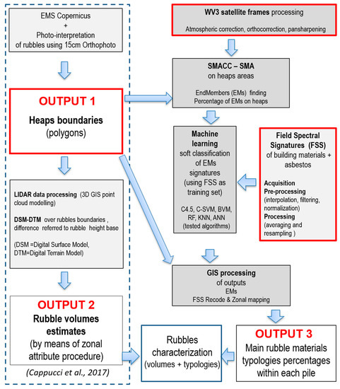 Flow diagram of the implemented procedure. The input data are: (1) LiDAR point cloud data, RGB aerophotos, Copernicus EMS building damaging grade map; (2) WorldView-3 multispectral data; (3) hyperspectral signature library; (4) polygonal cover and related attributes of rubble heaps, from previously developed procedure [], in input to SMACC and GIS processing. The rough outline of rubble volume estimates procedure (dashed box) has been included here only for completeness.