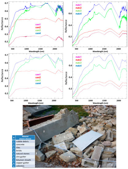 Eight principal constituents (macro-classes) of urban rubble were identified in the field during the two-day survey, during which 150 hyperspectral signatures (about 2300 narrow bands for each spectral signature) were acquired. In Table 1, the nine related macro-classes, including the asbestos macro-class, whose spectral signatures were derived from the literature, are reported.
