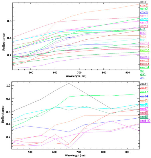 The graph in the upper part of Figure 4 shows the multispectral signatures resampled using the WV3 sensor filter function (the asbestos signatures were omitted for clearness). The multispectral signatures of the 10 endmembers, extracted via SMACC from WV3 data of rubble heaps, are reported in the lower graph of Figure 4.