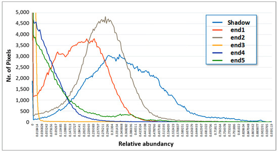 The first five endmembers except end3, plus shadow, are the most abundant, on average, as reported in Table 2. In particular, the shadow shows high abundance values in a relevant number of pixels, as shown in Figure 5, where the distributions of the abundance of the shadow and first five endmembers are depicted.