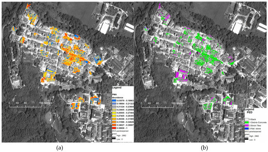 As shown in Figure 6, the abundance of the first macro-class (concrete-rubble debris) is prevalent in a large number of pixels (see Figure 6b—PED) and shows the highest values (as shown in Figure 6a—PMA), while those of the other two macro-classes are lower in value and prevalent in a minor number of pixels.