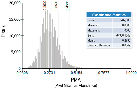 Taking into account the abovementioned results, the PED categorical distributions corresponding to different minimum PMA thresholds (0.25, 0.35 and 0.45), selected on the basis of the PMA’s histogram (Figure 7), were calculated to be used for the accuracy assessment. In this way the three rightmost fractions of the histogram distribution (Figure 7) were selected to generate the maps whose accuracy was assessed.