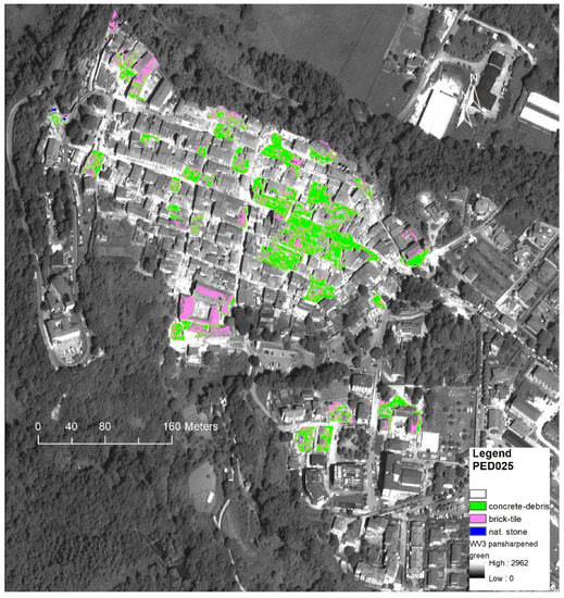 The enormous amount of rubble from partial or total collapse of buildings/structures caused by an earthquake hitting urbanized areas with vulnerable historical centres, like those of many Italian towns, must be rapidly mapped and characterized after catastrophic events. This activity is mandatory to support the emergency activities and ensure the accessibility, rescue and first assistance to population. During the post-emergency phase, reliable information about the distribution and characterization of seismic rubble in term of volume/weight and typology is fundamental for their proper management which involves handling, removal, pile up and transportation to recycling facilities or final disposal sites []. Despite this information being particularly valuable for optimizing the post emergency responses, there are not many methods to provide extensive and reliable estimates of the amount of seismic urban rubble in terms of volume/weight and typology distribution, including the detection of possibly dangerous materials. With this aim, remote sensing techniques, coupled with GIS, can provide valuable opportunities [,,,,].