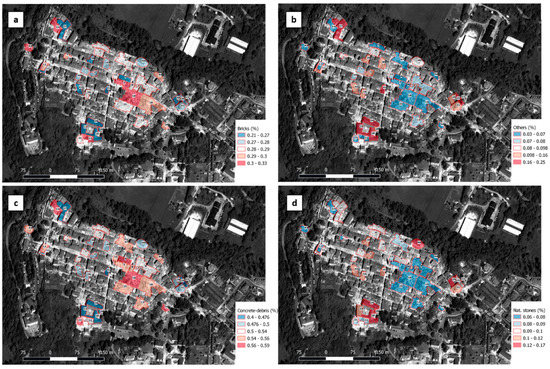 Finally, the zonal processing of the raster map derived from the classification implementing the per pixel distribution of endmembers percentages, provided us with the relative percentages of the three main categories used for the accuracy assessment within the rubble heaps. The estimated distributions of the main materials’ typologies are shown in Figure 9. The most abundant rubble heap typology (macro class) is represented by concrete/debris (range: 40–50%), followed by brick/tiles (range: 25–30%) and natural stones (range: 7–17%), with other materials (metal, plastic, bitumen sheath, etc.) deriving from the remaining endmembers completing the list (range: 3–25%).