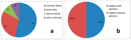 The classification of materials present on the surface of rubble heaps is one of the most important results achieved in the present study. Among these, asbestos is of great interest due to its implications for human health (for both earthquake survivor population and rescue teams). The present work showed that concrete debris and brick tiles are more abundant (Table 7 and Figure 11a) within the study area and about 50% of the rubble heaps may contain asbestos (in different quantities; Table 7 and Figure 11b).