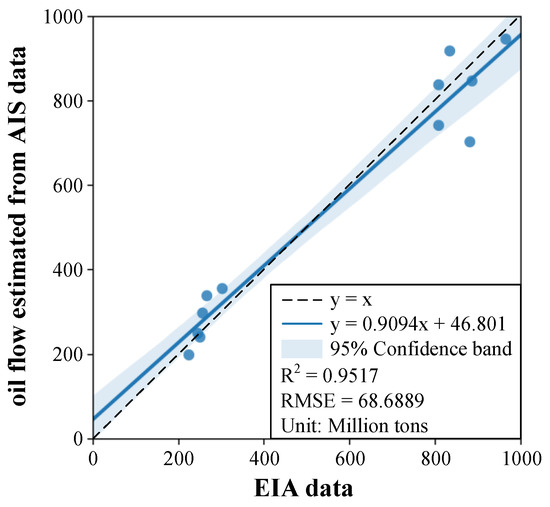- The annual oil flow estimated from the AIS data is similar to the EIA data in terms of the value and variation trends, except for the Cape of Good Hope. The statistics, such as R2 and RMSE, show that the two sets of data are similar and have a strong correlation. The general directions of the oil flow in the four MOCs are consistent with the actual directions. Therefore, the framework proposed in this study is reliable.