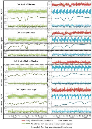 - Compared with the EIA data, the daily, monthly, and seasonal oil flow estimated in this study has smaller timescales, which can provide more information. The cycles of the four MOCs differed greatly, but their trends are consistent with each other’s. Furthermore, there were two obvious troughs in the oil flow through the straits of Malacca and Hormuz.