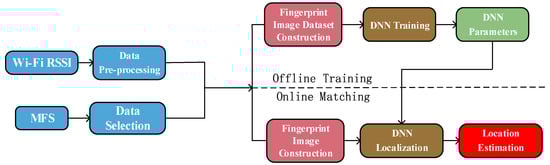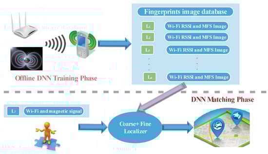 As illustrated in Figure 1, the proposed fingerprint localization system normally consists of two phases: the offline phase and the online phase. During the offline phase, UE collects a series of Wi-Fi Received Signal Strength Indications (RSSIs) from all access points (APs) or magnetic signal magnitude at known locations, known as Reference Points (RPs), to build a fingerprint database. Therefore, each RP has its own fingerprint, containing the known locations and the received RSSI or magnetic signal magnitude. Then, the proposed deep learning model is used to train with the pre-constructed fingerprint database. At the online phase, the well-trained deep learning model is used to match the currently received signals against the fingerprint database, and the location of UE is determined by the best-fitted RP [3,5].
