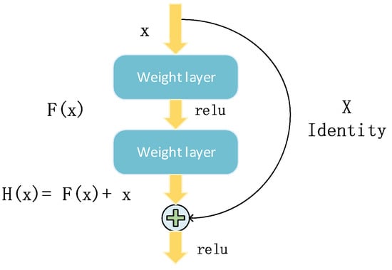 With the development of deep learning, researchers have found as the number of layers of the neural network increases, the learning ability of the network will increase. However, owing to the overfitting problem, the generalization ability will be decreased as the network goes deeper. This problem has troubled researchers for a long time. With further research, [28] proposed the deep residual model, and it successfully improved the learning ability of the network. As is shown in Figure 5, the residual model is constructed by adding a skip connection. The learning for the target map H ( x ) is transformed into H ( x ) = F ( x ) + x , and learning F ( x ) is easier than H ( x ) . By cumulating multiple residual modules, the degradation problem of DNN can be effectively alleviated and performance improved.