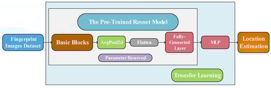 Figure 3. Structure of the proposed localization system based on deep neural network (DNN) and fingerprint image learning. DNN contains Resnet and multiple perception layer (MLP)-based transfer learning.