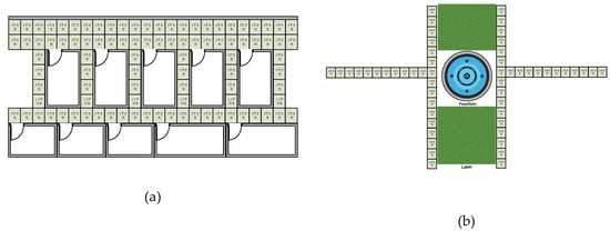 Figure 9. Floor plan of the test site. These two localization areas are divided into dozens of grids. (a,b) Indoor and outdoor test sites, respectively.