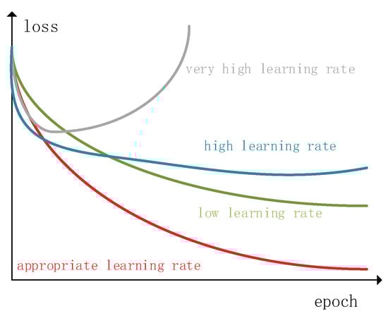 LR is a critical hyperparameter in deep learning. During the training process, appropriate LR will help increase the fitting ability and improve the training speed of DNN. Conversely, improper LR will cause the network converge to a local minimum and greatly reduce the learning ability. However, as shown in Figure 10, a suitable LR is difficult to pike up. In addition, a fixed LR may cause the network to oscillate back and forth between the smallest point [29]. In order to solve this problem, the LR needs to dynamically adjust to improve the convergence of the network. Therefore, in this designed DNN model, the initial LR was set as 0.001, and, after every 35 epochs, we dynamically adjusted the LR to half of its original size.