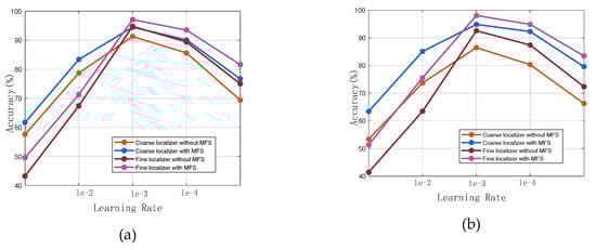 As shown in Figure 11, we tested the localization performance of our proposed localizer with respect to LR and MFS. Figure 11 shows that localization accuracy achieved the highest when the LR take was 1 × 10−3. This is an appropriate LR for the DNN to converge to the global minimum. It can also be observed that the MFS effectively helped enhance the localization performance both for the coarse localizer and fine localizer. This is probably because the selected MFS enriched the localization features. The fine localizer with inappropriate LR performed worse than the coarse localizer; this may because the network was already at a local minimum at the beginning of training, and it was difficult to effectively converge. With appropriate LR, the transfer learning-based fine localizer can effectively utilize prior information of the pre-trained coarse localizer to achieve a better localization performance.