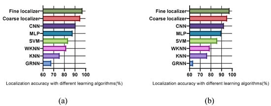 Figure 13. The localization accuracy for different learning algorithms. (a,b) Indoor and outdoor localization performance, respectively.