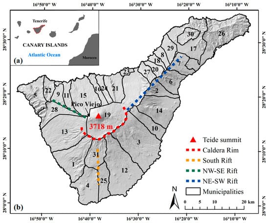 Location of the Canary Islands (a) and the island of Tenerife, which consists of 31 municipalities (Caldera rim, south, NE-SE and NE-SW rifts, the reader is referred to Carracedo et al. []). (b) Full names of Tenerife’s municipalities are given in Table 1.