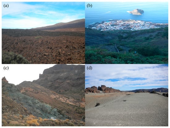 Volcanic landscape on Tenerife. (a) Historical lava flows within the Las Cañadas caldera. (b) Lava in proximity to Garachico, a northwestern Tenerife municipality once destroyed by lava flows but later re-built on them. (c) Historical PDCs. (d) Historical tephra. Photos were taken by Prof. Dr. Matthieu Kervyn in Dr. Long Li’s fieldwork on Tenerife in November 2013 [].
