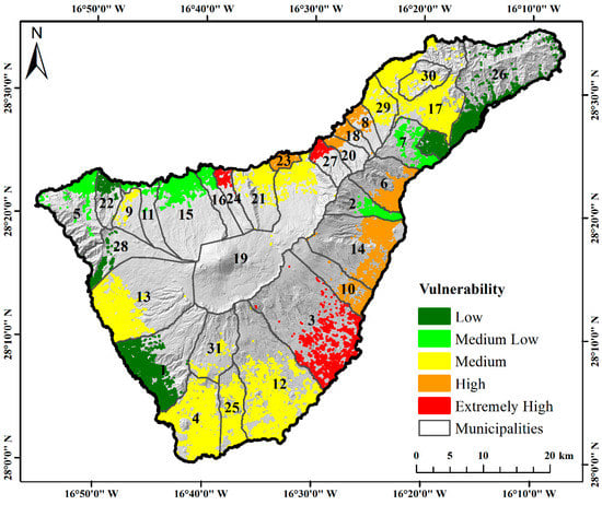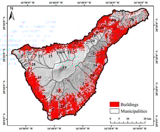 Vulnerability consists of a variety of components, which depend on the context of the research. Scaini et al. [] assessed the physical vulnerability of sub-systems such as population, buildings and transportation in the three northern cities of Tenerife. Other studies have assessed community vulnerabilities from a socio-economic [] or demographic [] perspective. We adopted the socioeconomic perspective in this study, as this would be more appropriate for a comprehensive volcanic risk assessment. In order to more accurately analyze the spatial distribution of vulnerability in Tenerife, this study used buildings in each municipality as the evaluation unit rather than the entire municipality.