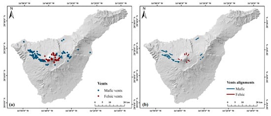 It would be preferable if all the potential cones and vents are considered for hazard simulations. Although they can be identified through visually interpreting remote sensing image data such as Sentinel-2 and Landsat 8, fieldwork-based validation is required for such an approach. As such, we referred to the study of Marti and Felpeto [], which provides a reliable distribution of vents and vent alignments of mafic and felsic eruptions. The locations of vents and vent alignments were extracted by manual vectorization and shown in Figure 4. All vents and vent alignments are younger than 35 Ka, as it represents the maximum period for the Teide-Pico Viejo stratovolcanoes and an upper time limit for the massive appearance of phonolites on these volcanoes []. However, the youngest eruptions in south has been dated as 96±5 Ka []; south vents were, therefore, not considered. Among the considered vents and vent alignments, felsic ones were used in eruptive Scenario 1 and mafic ones in eruptive Scenario 2.