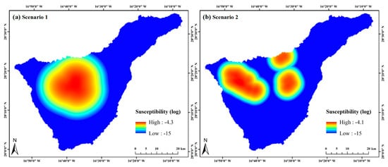The vent susceptibility maps indicating the probabilities of future vent locations. (a) Susceptibility for Scenario 1. (b) Susceptibility for Scenario 2.
