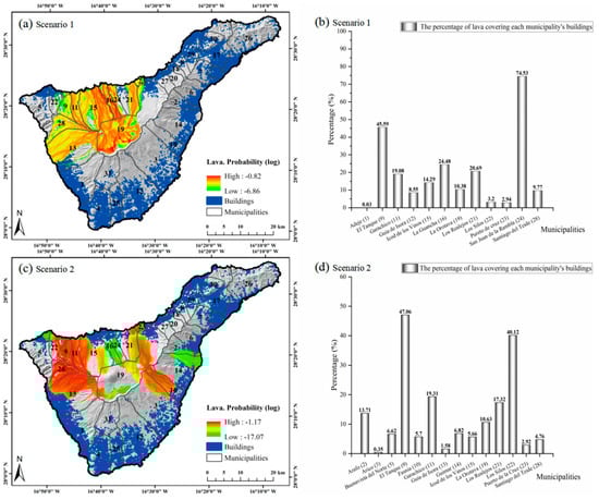 (a) The distribution of simulated lava flows in Scenario 1. (b) The percentage of lava covering each municipality’s buildings in Scenario 1. (c) The distribution of simulated lava flows in Scenario 2. (d) The percentage of lava covering each municipality’s buildings in Scenario 2. For the reader’s convenience, the number labels (see Table 1) are always placed after the place names in the text.