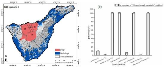 In Scenario 1, the PDC was distributed in the north of Tenerife (Figure 7a). While buildings of four municipalities, i.e., San Juan de la Rambla (No. 24), La Guancha (No. 16), Icod de Los Vinos (No. 15) and Los Realejos (No. 21), were (nearly) all inundated with the pyroclastic flow, some were partially affected, e.g., Puerto de la Cruz (No. 23), Guia de Isora (No. 13) and Garachico (No. 11) (Figure 7b). Both Guia de Isora and Pureto de cruz were the lightest affected municipalities (the percentages of buildings covered were 0.04% and 0.53%, respectively).