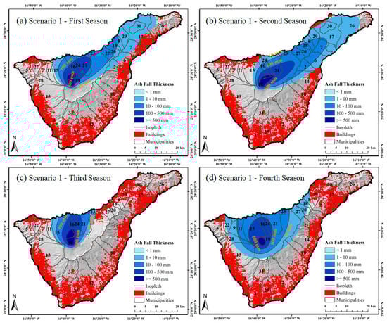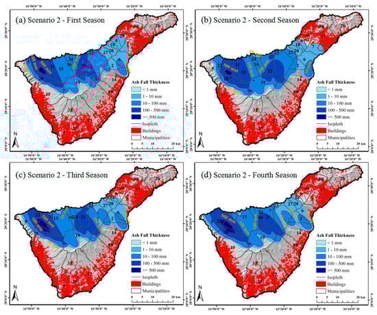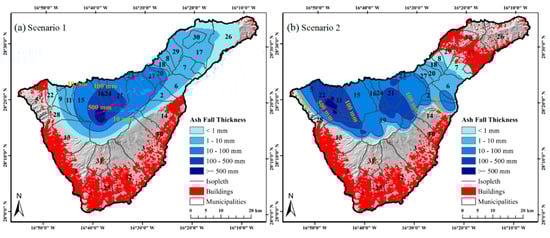 In the two eruptive scenarios, we simulated volcanic ash fall in four seasons (Figure 8 and Figure 9). Furthermore, the overall ash fall maps for the two scenarios were generated by averaging the seasonal ash fall simulations (Figure 10). Compared with lava flows and PDC, ash fall had the widest influence. As a result of the impact from wind direction and wind speed, ash fall in Scenario 1 was mainly distributed in the north of Tenerife, e.g., Icod de los Vinos (No. 15), Los Realejos (No. 21) and La Guancha (No. 16), with a maximal thickness of 3.00 m (Figure 10a), while ash fall in Scenario 2 was mainly distributed in the north and northwest of Tenerife, e.g., Los Silos (No. 22), Santiago del Teide (No. 28), La Garachico (No. 11) and EI Tanque (No. 9), with a maximal thickness of 0.74 m (Figure 10b). The northeast of Tenerife was affected by ash fall in Scenario 1, but not in Scenario 2. The east of Tenerife was influenced by ash fall in Scenario 2 more than in Scenario 1. In both eruptive scenarios, the south, southeast and southwest of Tenerife were not under the impact of ash. Following the classification method proposed by Scaini et al. (2014) [], we divided the volcanic ash thickness into five levels, from level I (thinnest) to level V (thickest).
