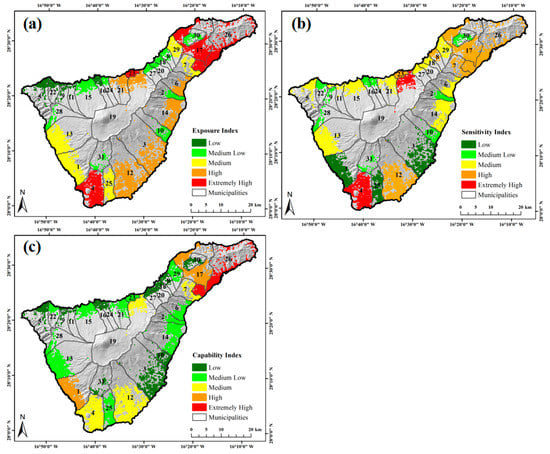 In this study, social vulnerability is an indicator of the ability of a group of people or a community to respond to and recover from a disaster. Based on the VSD framework, the vulnerability of Tenerife was divided into three components, namely exposure, sensitivity and capability. The three factors resulted in the spatial variability of Tenerife’s vulnerability (Figure 12). For example, Santa Curz de Tenerife (No. 26) had extremely high exposure (mainly because of high population) (Figure 11a) and high sensitivity (mainly because of low education and young/old population) (Figure 11b), but its high capability (Figure 11c) resulted in low vulnerability in this populated municipality. While La Orotava (No. 19) and Arona (No. 4) had high exposure (large agricultural acreage) and sensitivity (many disabled individuals), the two municipalities had moderate vulnerability due to moderate capability. Different from the two municipalities, San Juan de la Rambla (No. 24) had low exposure, sensitivity and capability, which makes it extremely vulnerable. It is suggested that the vulnerability assessment should be based on consideration of all the three components.