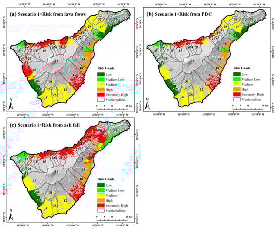 Before calculating the volcanic risk of each eruptive scenario, we needed to standardize the hazards and social vulnerability. Both lava flow and PDC hazard maps were reclassified. Areas affected by lava flows or PDC were assigned a value 5, and areas that have not been affected were assigned a value of 1. Based on the tephra grading standards of Scaini et al. [], the ash fall hazard map was divided into five grades by cumulative thickness, ranging from grade 1 (representing cumulative thickness of tephra < 0.001 m) to 5 (≥0.5 m). By applying Equation (7), volcanic risk was calculated on a pixel basis, and five volcanic risk maps were produced, three for Scenario 1 and two for Scenario 2. This was realized through spatial analysis in ArcGIS. According to Jenks natural breaks classification method, risk values were reclassified into five grades, namely extremely high, high, medium, medium low and low