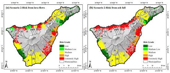 - In Scenario 1, high risk for three volcanic hazards is expected in the north of Tenerife, including the municipalities of La Guancha, Icode de los Vinos and San Juan de la Rambla. In Scenario 2, high risk for lava and ash fall is expected in the northwest and the east. Volcanic risk management should be strengthened in such municipalities.