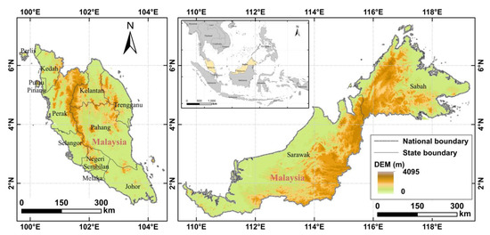 Located in Southeast Asia, Malaysia is between the Pacific Ocean and the Indian Ocean. It is divided into East Malaysia and West Malaysia by the South China Sea (Figure 1). Most of Malaysia’s coastal areas are plains, while the central part is a plateau covered with dense tropical rainforests [23]. West Malaysia accounts for approximately 40% of the country’s land area, and mountains extend from the interior to the periphery. The tropical rainforest of Kalimantan in East Malaysia is the second largest tropical rainforest in the world, second only to the tropical rainforests of the Amazon basin in South America [24]. According to the Köppen climate classification [25], Malaysia has a tropical rainforest climate with high temperatures and rain throughout the year. The annual precipitation is over 2000 mm, which produces advantageous conditions for oil palm growth. Malaysia has been growing oil palms on a large scale since the 1960s. In the mid-1960s, the government encouraged private individuals to replant arable land, old rubber plantations, and old coconut gardens into oil palm plantations [26].