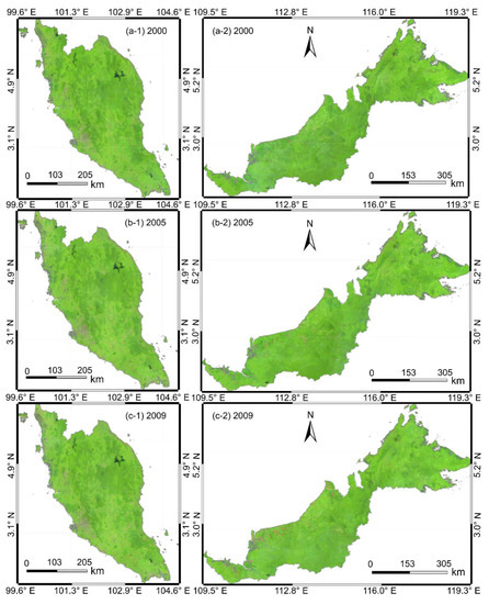 The maximum cloud coverage of the Landsat image used in this study was 30%. The cloud coverage of images in 2018 and 2015 were less than 15%, in 2000 and 2005 less than 20%, and in 2009 less than 30%.